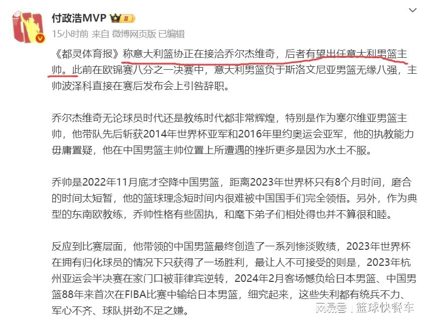 今年夏天,中国男篮在郭士强的带领下,在亚洲杯上大杀四方,最终获得亚洲杯亚军的好成绩。尽管中国队最终没有夺冠,输给了澳大利亚,不过,在亚洲球队中,中国队的战绩依旧是最好的。而在郭士强扬眉吐气之际,作为男篮的前任主帅,乔尔杰维奇也找到下家了。作为赵继伟的恩师,乔帅在去年下课以后,目前他已经找到下家,根据外媒报道,乔帅极有可能会成为意大利男篮下一任主帅。